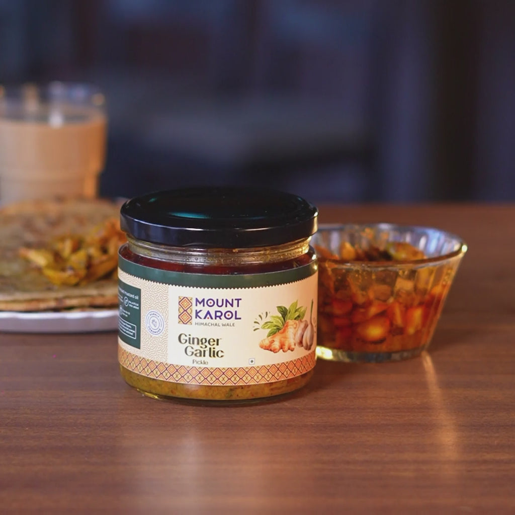 Elevate your everyday meals with the tangy flavors of Mount Karol's Ginger Garlic Pickle. Handcrafted by skilled Himachali women, this pickle brings the authentic taste of the mountains right to your kitchen. Grown in a natural environment, the garlic cloves and ginger used in this pickle are carefully selected to enhance its appetizing flavor.